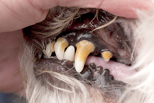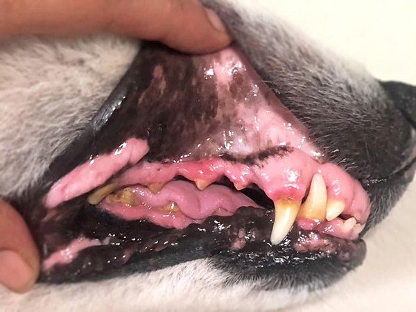 老年狗狗口腔疾病的形成,與牙周病密不可分。隨著年齡增長,牙齦與牙周組織的修復能力下降,加上長期牙菌斑刺激與免疫系統失衡,便容易引發慢性發炎,而導致牙齒支持結構被破壞。在犬隻,特別是臘腸、玩具貴賓等小型犬,嚴重牙周病常導致上顎犬齒根部與鼻腔之間骨質被破壞,形成口鼻瘻管(也就是在口腔與鼻腔之間形成不正常的通道),造成口腔細菌能恣意進入鼻腔,引發慢性鼻炎、打噴嚏甚至鼻涕帶膿或血。此外,老年犬的口腔團塊與腫瘤(如鱗狀細胞癌、纖維肉瘤、黑色素瘤)發生率高,也常被誤認為單純牙齦紅腫或牙周炎。若未及時診斷,可能快速惡化並影響進食甚至威脅生命。這些腫瘤可能局部侵襲或轉移,需早期診斷與處理。其他風險因素還包括免疫力下降、內分泌疾病(如糖尿病)、肥胖與飲食習慣不佳。這些都會加重口腔發炎與感染,讓疾病更難控制。