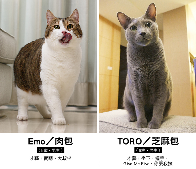 很多人問馬達媽,為什麼幫他們兩個取這麼特別的名字,她說,Emo是Emotion的意思,因為Emo其實很神經質,只要一有風吹草動就會被嚇到;而Toro則是因為他剛來家裡時,個子小小綿綿的看起來很可口(?),夫妻兩人都很愛吃生魚片,於是就順理成章成為美食Toro啦!