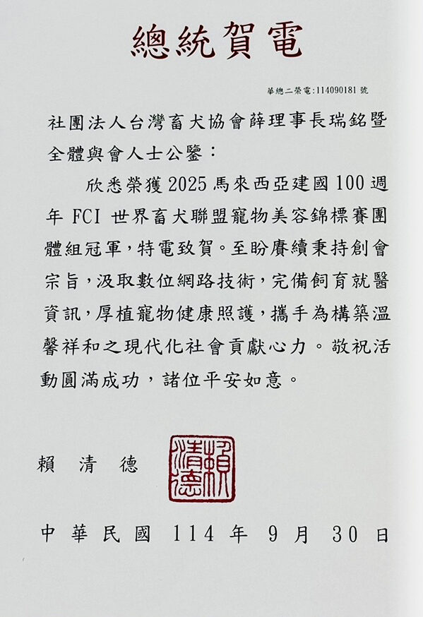 外國的月亮不再比較圓!社團法人台灣畜犬協會(簡稱畜犬協會)於9月25日派員前往馬來西亞,參加第3屆世界畜犬聯盟寵物美容錦標賽,並在團體賽中奪得冠軍。代表選手邱建榮更脫穎而出,獲頒「最佳美容師」殊榮,充分展現我國寵物產業的世界一流水準。團隊透過無數培訓,並藉由彼此間的交流來充實自我的技法,整個產業的每個環節之間的配合皆是環環相扣的,持之以恆的努力終究在這一次比賽開花結果,也要感謝多方支持與選手們各自的實力與現場發揮,才能獲得此一殊榮。這一次賽事由世界畜犬聯盟(Federation Cynologique Internationale, FCI)主辦,共有7個國家參賽。台灣隊伍出發前,畜犬協會特地拜會農業部,並由杜文珍次長授旗,期勉5位參賽選手為國爭光。比賽分為水獵犬、貴賓犬、㹴犬、其他剪毛犬種及寵物犬等5大類別,台灣代表隊在㹴犬組和團體總成績均拿下冠軍,而邱建榮更榮獲全場MVP,本次輝煌榮耀再次證明台灣寵物產業實力已躋身世界舞台。