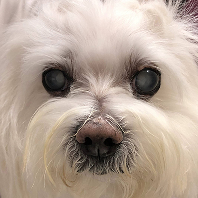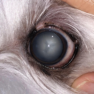 白內障是因為水晶體逐漸變得不透明,使光線無法正常穿透水晶體至視網膜產生視覺,而使視力減退。若惡化至完全成熟的白內障,動物會完全失明,走路會撞到傢俱或東西,喪失方向感,動作靈活度降低,一般來說狗比貓更常見,但需要注意白內障並非老年動物獨有,在台灣有許多品種(如:貴賓、比熊)好發遺傳型白內障,1~7歲即可能發病。有些年齡七歲以上的中老年犬,肉眼看到水晶體中央有些灰白,不一定是白內障病變,常是水晶體的正常老化,稱為水晶體核硬化(nuclear sclerosis),並不會影響視力,也無須治療!另外老年犬除了可能發生白內障以外,更好發視網膜退化、玻璃體退化等,在門診中許多失明的老年犬,家人們以為失明原因為白內障,但經檢查發現水晶體的變化為正常老化之核硬化,但失明的原因常為視網膜的退化或其他需要醫療介入的問題,如青光眼、葡萄膜炎等。